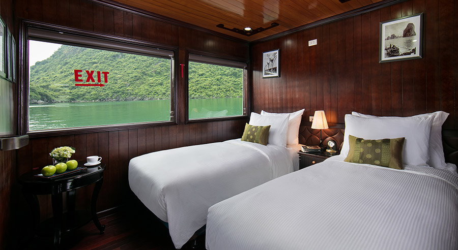 Flamingo cruise was launched in 2014 and designed following the style of Vietnamese traditional pattern. It has the dimensions of 31 meters in length, 5.8 meters in height, and 8 meters in width. It has three decks with 14 cabins in total. Cabins are classified into three types, including 8 Deluxe Cabins (on the first floor), 4 Premium Deluxe Cabins (on the second floor), and 2 Suite Cabins (on the second floor). Especially, the first and the second floor will offer one connecting door cabin. In general, cabins are spacious and well-appointed, meanwhile suites are more luxurious with large en-suite bathrooms.
