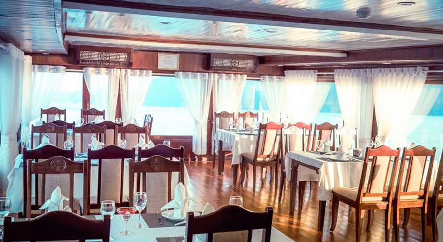 Like many cruises of its range, Halong Phoenix Cruise is designed with traditional Vietnamese concept from outer to inner space, formed by wooden furniture and decoration. The little details such as Dong Ho folk painting or wall deco help enhance the “Vietnamese” feel on board. Besides these deluxe cabins, Halong Phoenix Cruise also offer numerous services with outstanding quality to passengers such as cozy dining rooms with panoramic windows and delicious menus, or airy sundeck to admire holistic landscape of the bay.