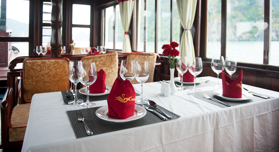 Indulge yourself in a spectacular Swan Cruise to experience Ha Long Bay at its best. The 3-star vessel offers 8-12 beautiful sea-view cabins including 5 twin, one triple, and two family connecting door, equipped with comfortable bedding, air-conditioner, and private bath. All the cabins are inspired by traditional culture and local materials such as bamboo. In addition, bar and dining rooms’ design offers a comfortable and romantic setting, with large windows allowing you to take the best sceneries of the bay while enjoying Vietnamese cuisine.